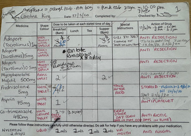Initially, my recovery was slow, particularly due to the catheter, but once it was removed, I established a routine and began taking small steps forward. The early wake-up call for medication rounds brought back the familiar routine. I found myself faced with numerous medications stored in tiny round white boxes, which took me well over an hour to consume. I asked my nurse about taking some pills after breakfast, but was told to take them before breakfast, especially the anti-rejection ones - either one hour before or two hours after.